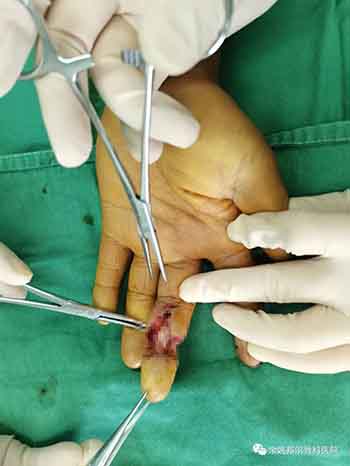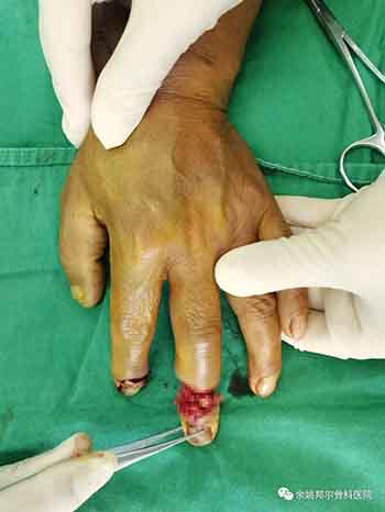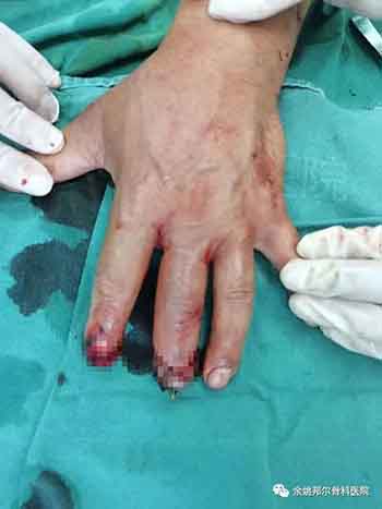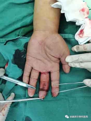 余姚邦爾骨科醫院的陳振技醫生及其團隊針對沈大哥的傷情進行了“左中指離斷傷、左食指末節開放性骨折清創縫合術+克氏針固定+血管神經肌腱探查修復術”。