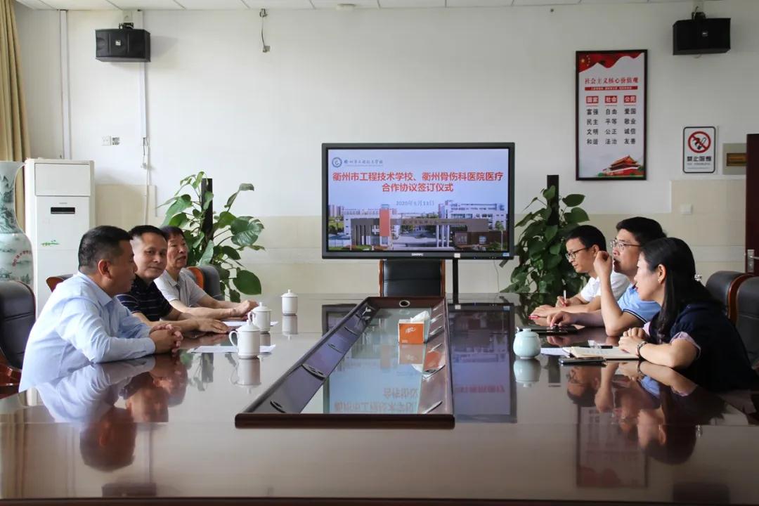 5月13日上午,在衢州工程技術(shù)學(xué)校,衢州骨傷科醫(yī)院與衢州工程技術(shù)學(xué)校舉行校企合作的簽約儀式。衢州骨傷科醫(yī)院總經(jīng)理王欽、醫(yī)療副院長王興、黨支部書記楊福壽3人,衢州工程技術(shù)學(xué)校院長傅林峰、副院長蔣靜、學(xué)生處/安保處主任王永誼3人參加了簽約儀式。