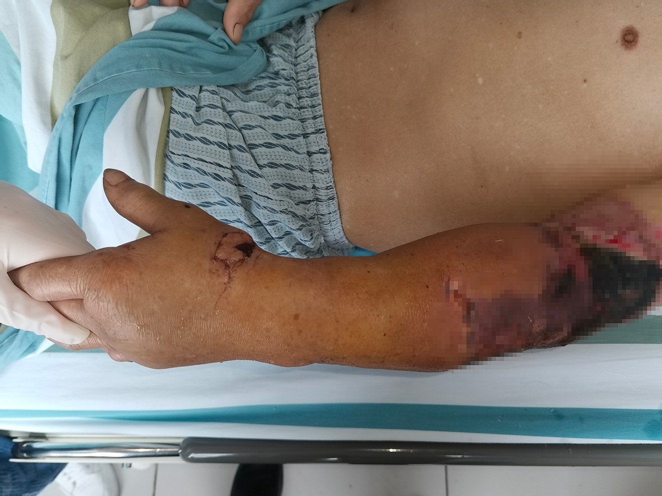 原來是G先生因為在工作時不幸發(fā)生意外,導(dǎo)致整個左上臂被卷入正在運轉(zhuǎn)的機器內(nèi),左前臂立即被完全碾斷,皮膚自上臂上段撕脫。簡單包扎后,被緊急送入杭州余杭邦爾醫(yī)院(杭州余杭骨科醫(yī)院)就診。